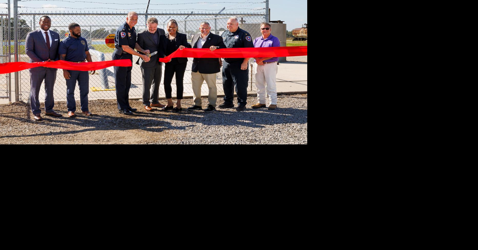 Louisiana DPS Principal Assistant Chief Bryan J. Adams and ExxonMobil Pipeline Company Public and Stakeholder Engagement Lead Michael Smith cut the ribbon to unveil the CO2 pipeline training prop. Gathering from left, River Parishes Community College …
